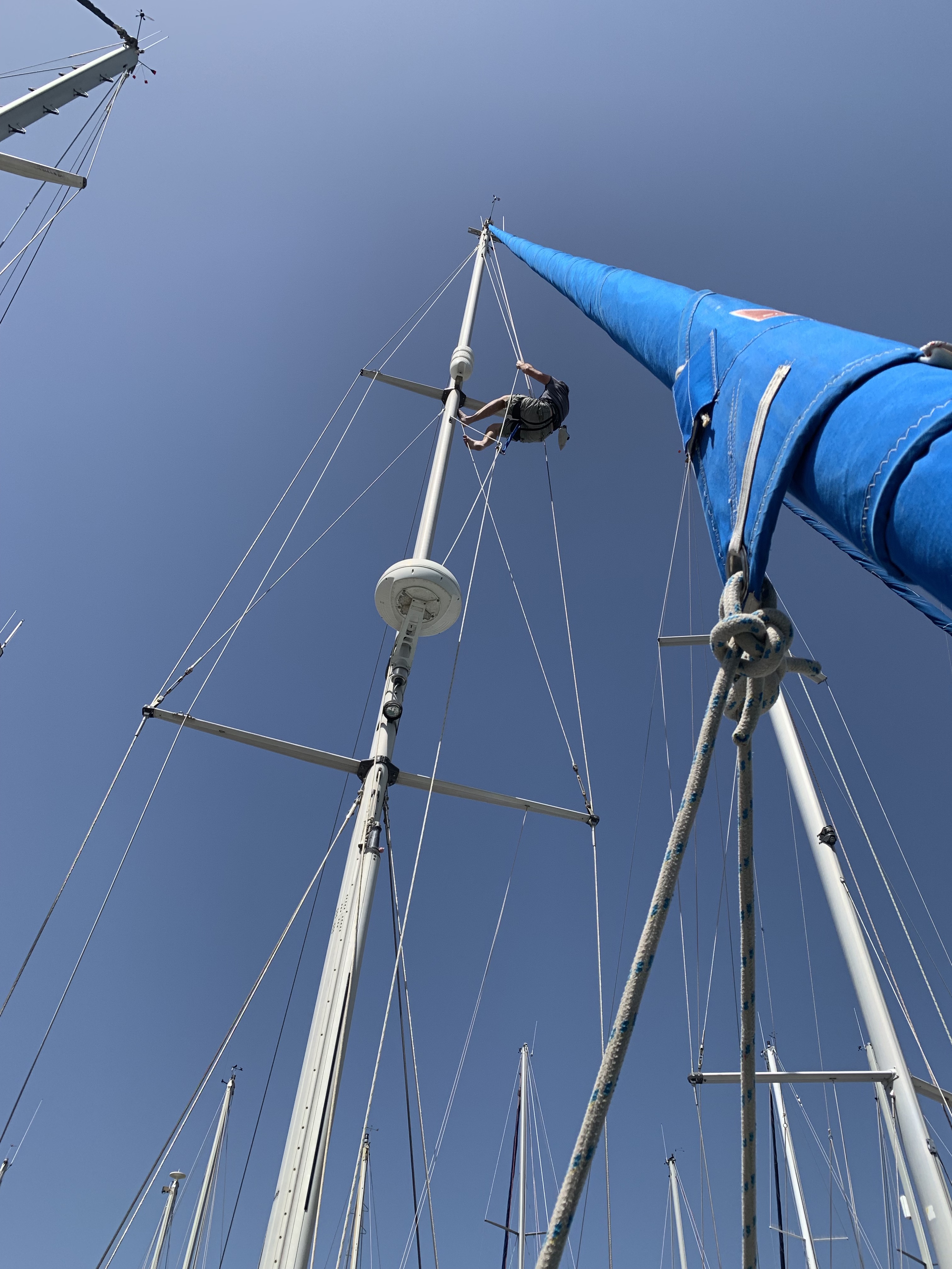 So, you are clear on your choice.ย Then you make an offer and bite your fingernails whilst the broker discusses that with the owner. You negotiate, you agree and then sign a contract.ย The contract says that you agree in principle to this boat subject to a marine survey (kinda like a house inspection but with about 1000 times more detail).ย You then choose a surveyor and see when he is available.ย Soon as possible please! Once he has a day locked in the broker and owner race around to sort out with the marina when the boat will be pulled out of the water. Favours are called in with the travel lift operator to pull the boat out at the best available time. ย Cath and Rick stump up the exorbitant fee for hauling the boat out. The surveyor will come early on the day in question and start looking into every nook and cranny inside the boat.ย His expertise is in EVERYTHING.ย He pulls up floors and disappears into the engine room. ย He climbs the mast to check the rigging and the instruments. ย It takes hours.ย Then he declares it time for a sea trial where the sails are shaken out, the engine is tested properly whilst underway, the bow thruster is tested, winches, steering, instrumentation. Then at the whim of the surly travel lift operator (favours didnโt quite work apparently) the boat is hauled out of the water, her bum is pressure washed over a giant sump then she is moved to a hard stand area while the surveyor checks out everything below the waterline. Then itโs dark. So he comes back the next day to finish it off. Phew. This guy is thorough!