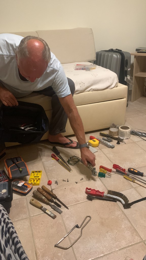 But it was also more than this. During our first year we had decided, perhaps even without speaking about it, not to throw away anything the previous owner had left on board as we figured with limited space he must have kept it for a reason. This year I realised in my irritation I was utterly over this and there were definitely things kept for no good reason I could ascertain. The 15 old heavy duty plastic wine glasses, the weird tongs that didn’t really work, the books, the odd plastic bags, the oversupply of plates had to go. While I started in the galley Rick also went into the various tool cupboards and tool boxes and boxes of fishing tackle (that we’ll never use). How many hacksaws do you need on board? How many screwdrivers? How many bottles of random cleaning products bought at boat shows with no use by dates on them? How many out of date suncreams? Off they went and as the load of unwanted ‘things’ went so did the mental load on us. Happily there is a time-honoured system at our boatyard where all things that can find another life elsewhere are taken by the staff so we were confident all would find new homes. I’ll never forget seeing one of the boatyard guys heading off on his motorbike with a cigarette hanging from his mouth wearing a pirate hat at a jaunty angle and carrying the plastic sword that went with it with a huge smile and yelling to all his mates to take a look at his new hat…yeah they were not ours and nor were they wanted. We are still trying to figure out just what the proper Englishman had them on board for!