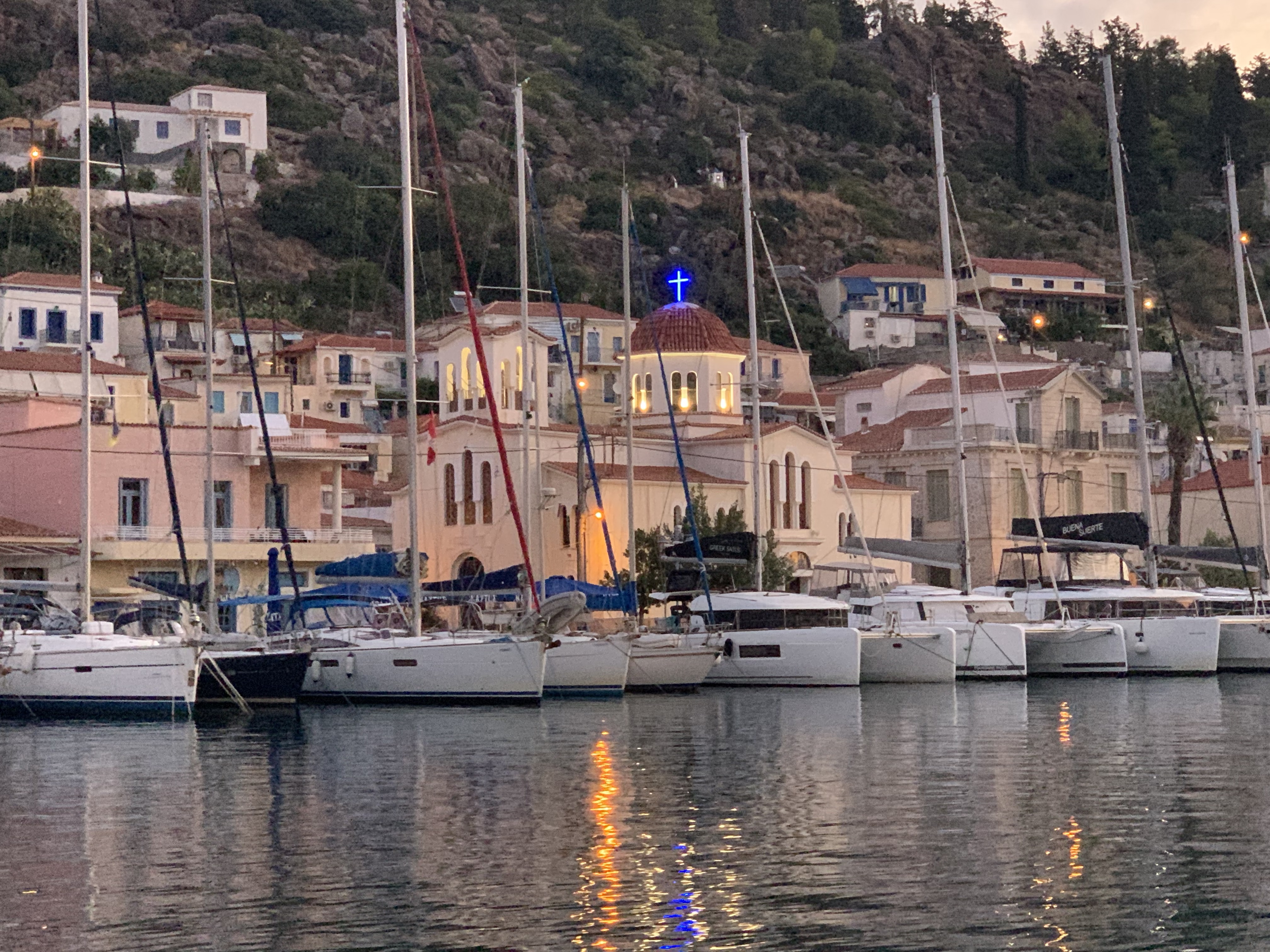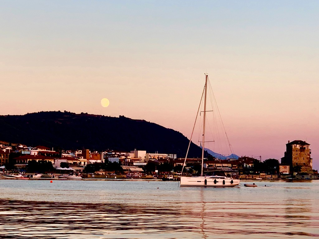 We headed off the next day deciding not to stay another night after a charter yacht dropped their anchor way too close to us. Any changes in wind direction could have resulted in a collision. We were on a hunt for gas for cooking as we had a leaking cylinder and it had run out way more quickly than expected lasting only 10 days rather than 4 weeks as per normal. No luck at the first two places we checked so we decided to move on to catch the rise of the full moon and spend the night anchored off the town of Ouranoupoli. This town is a take off point for the ferries that supply the peninsula and take pilgrims to the Monasteries. There are many shops selling icons painted by the monks at huge prices and local products such as honey and olives as well a jewellery stores selling rosaries and crosses. There were no shops selling gas, however!