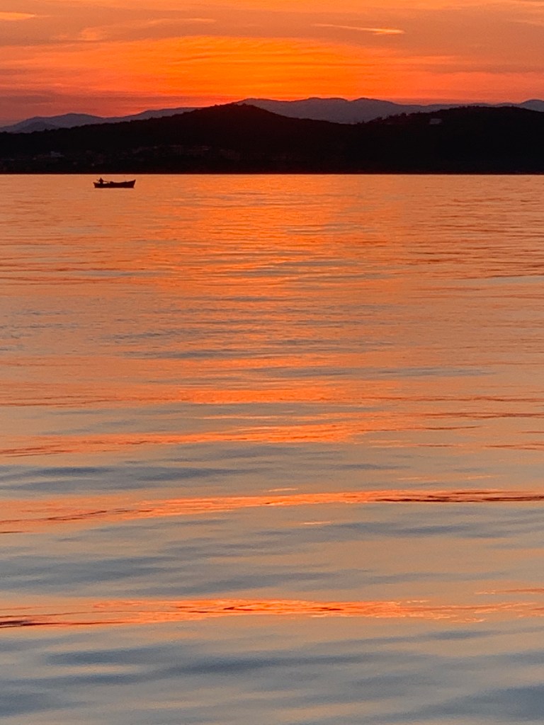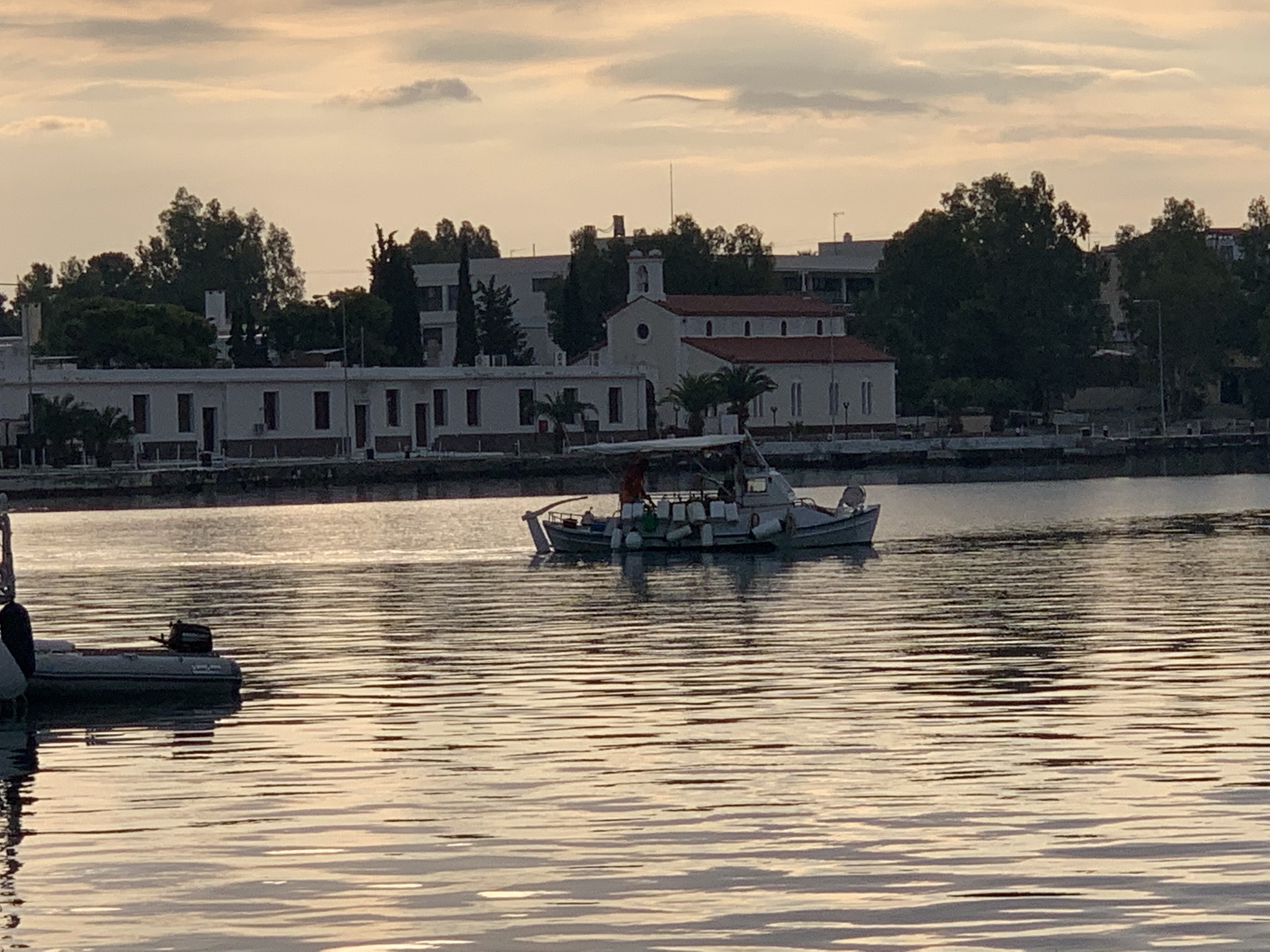 Yes, we were hit by the strong winds with the boat registering a gust of over 40 knots, but we sailed safely past craning our necks at a glimpse into such a different world. As we sailed up the inside of the peninsula, we saw many monasteries including one that looked as if it had been transported directly from Bhutan or Tibet so alike in building style was it. After we got to the large and very garish Russian monastery, we decided we’d had enough and headed towards the island of Ammouliani and a well-protected tiny cove on the west of the island. We anchored there overnight watching the snorkellers pass us by and the small hire boats come and go. At night the tiny fishing boats went slowly by catching squid and underwater lights marked the passage of octopus divers. I wondered about the monks and what time they would rise for morning prayers and if they thought about the rhythms of summer and the comings and goings of holidaymakers going on just a few kilometres away from them.