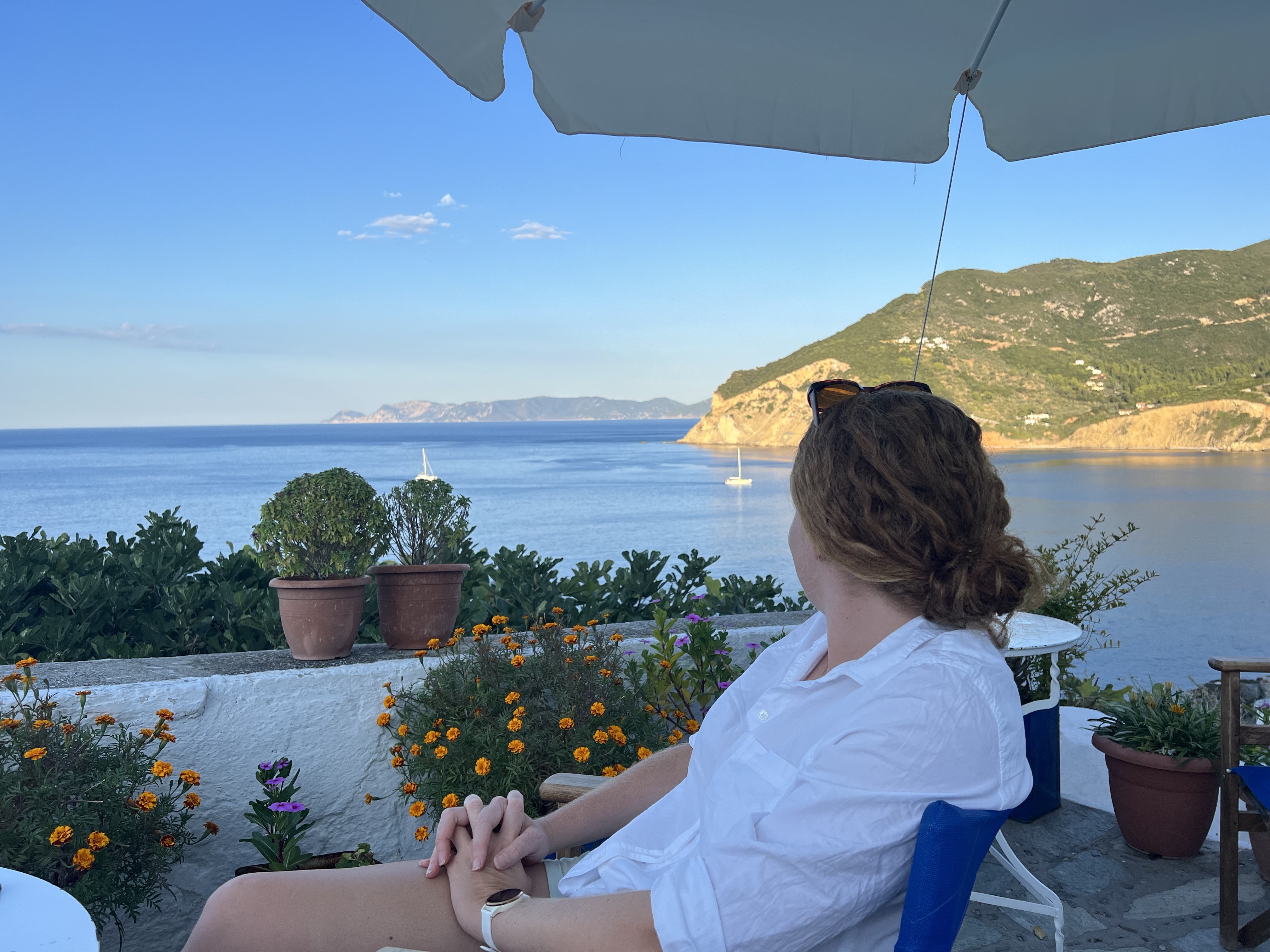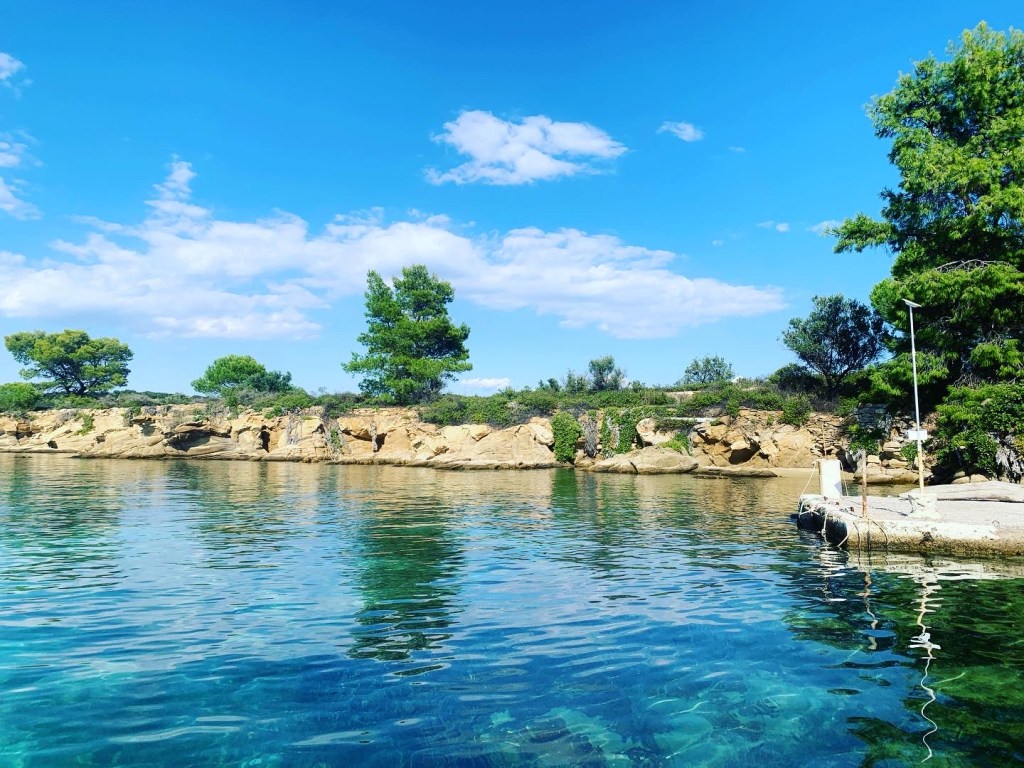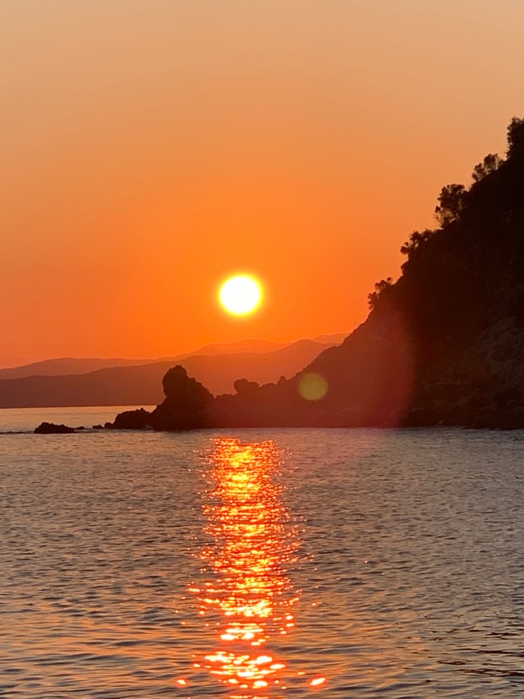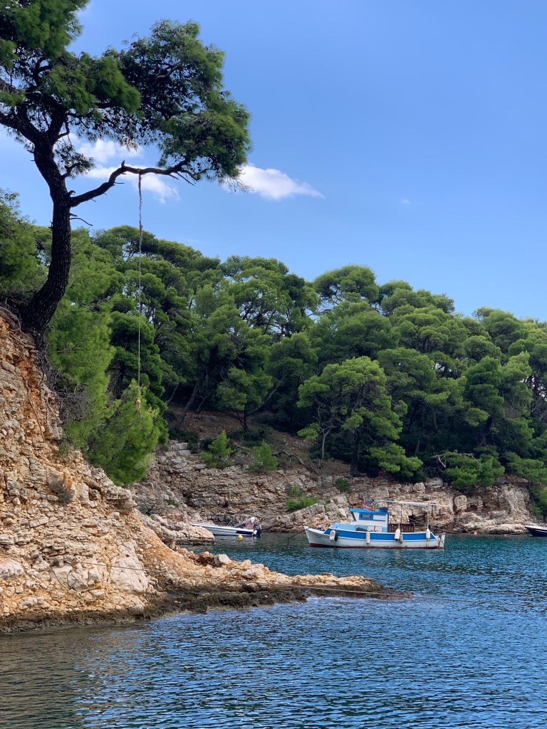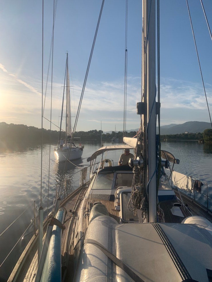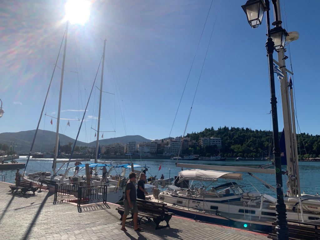 Diaporos and the surrounding islets and the small bays on the mainland were like I imagine the Aegean islands were many years ago. Public beaches, camping spots, little shacks built of tin and timber, more stylish villas and family compounds surrounded by manicured olive groves. Green grass, white beaches and umbrellas and beach chairs left on the sand overnight as no one would dream of taking them. The hillsides are covered in pine making the whole area green and seasonal storms means there’s fresh water around all year. Apart from the little hire boats, which I actually celebrate as it means anyone can get on the water and have an experience like we are getting, there was a total absence of mass tourism and beach bars with loud music until the wee small hours. Instead, it was a little old fashioned, chilled out and absolutely perfect for us. Plus the water was incredible. We anchored in every place we could. Sometimes going to 4 places in a day as we looked for the perfect spot for a swim or an overnight anchorage. Friends had said they stayed 3 weeks here just getting lost in the environment. I could see how. Even before we had to leave to head south to meet Ambar, I could imagine us coming back to this little gem of a spot. We both couldn’t believe how much it reminded us of Tasmania. I think it was the overall vibe rather than the landscape although the crystal-clear water and granite rocks was very reminiscent of the Bay of Fires in Tassie…just 15 degrees warmer for a swim! We also met some most excellent people, Nicky and John an expatriate English couple, who had spent every summer here for 40 years and knew everyone and pretty much everything about the area. We were enchanted when they invited us to visit their little whitewashed cottage nestled in a private bay amongst an orange plantation. Compelling reasons to return!