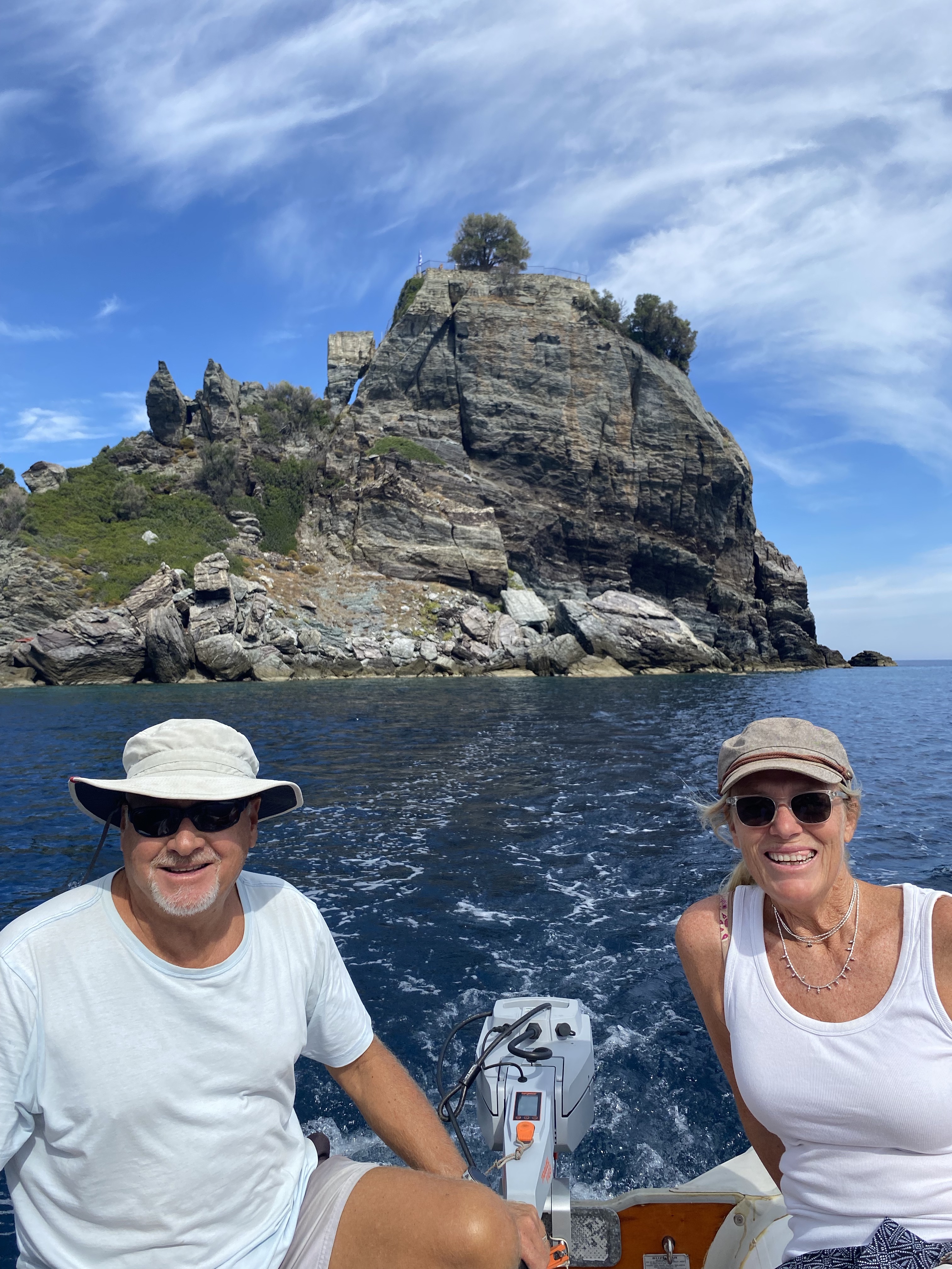 After Ambar was on her way home to Australia, we pretty quickly left the Sporades and headed into the Evia Channel. Evia island runs mostly parallel to the Greek Mainland and is Greece’s second largest island. It was ravaged by bushfires several years ago and much of the pine forest is gone and townships and forests will be recovering for generations. En route we managed to snag some old fishing net around our rudder and propellor. We both realised something was wrong when dropping the anchor. I saw a 20 metre long ribbon of what looked like white raffia trailing beneath the boat and out behind us and Rick heard a change in the engine that he didn’t like. It was immediately clear it was attached to us, so Rick braved the local jellyfish and the cooler water and dived under the boat multiple times to cut away the debris wrapped around the propellor. He did a fantastic job and got all of it and we were able to sail away the next day with no damage.