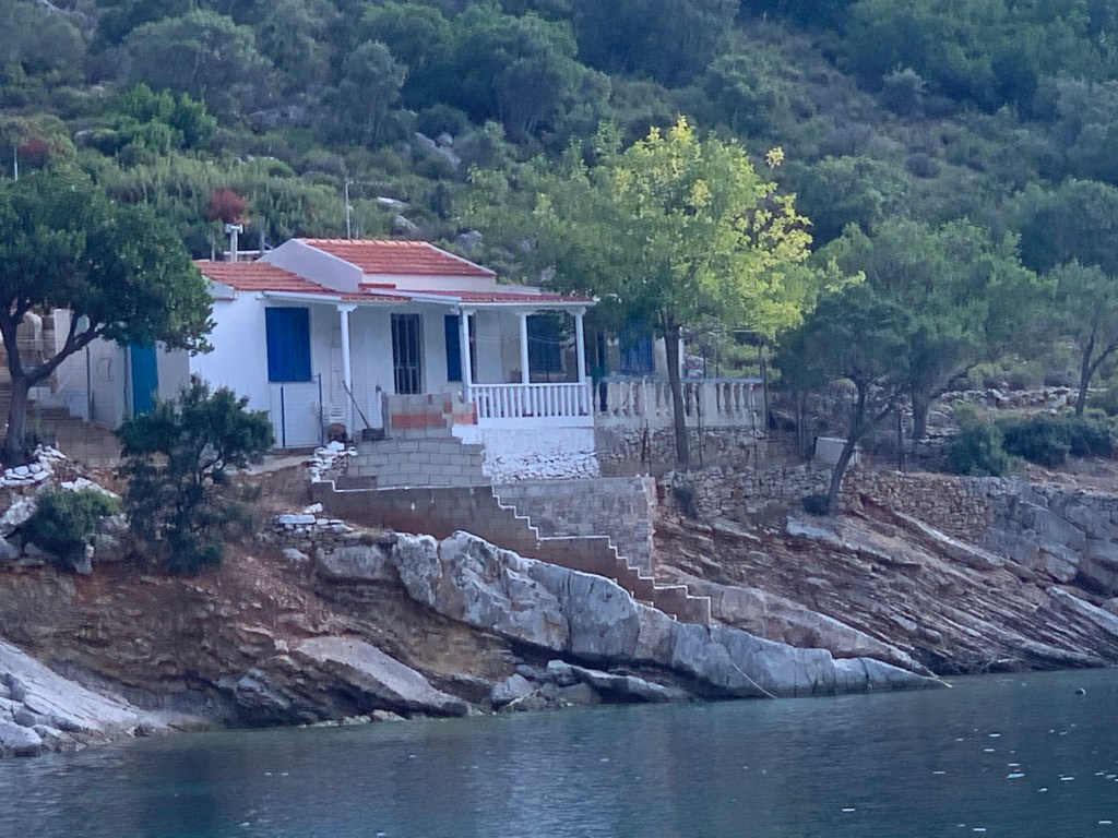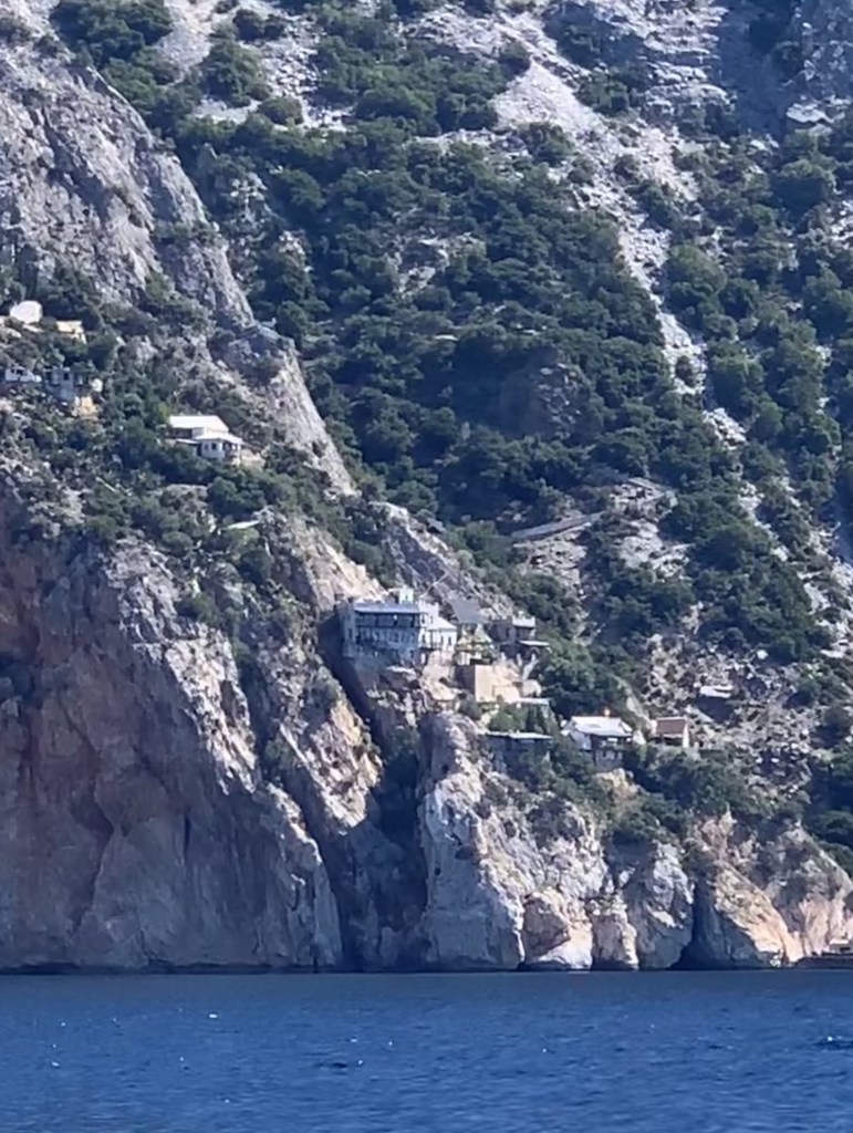 We’d had a great sail over in strong breeze and zero swell. Pretty much perfect sailing conditions. The boat was well reefed so we wouldn’t be overpowered if we went close to shore ignoring the warnings about the wind acceleration zone of Mt Athos so we decided to get a good look close as we could to shore. This was the first time I had really wished for a good camera with a telephoto lens as getting good photos of the Monasteries and especially of the small cells that monks sometimes inhabit for decades were almost impossible from the distance we were away from land. The monks sometimes live in these tiny spaces for their whole adult lives often without leaving. They receive supplies in wicker baskets, sometimes transiting the indented coastline by flying fox, and dedicate their lives to prayer, contemplation, and isolation. I can highly recommend reading this and checking the amazing photos if it interests you: https://www.theguardian.com/artanddesign/2017/jan/05/the-holy-mountain-monks-of-mount-athos-photo-essay The end of the peninsula on the slopes of Mt Athos were wild and isolated apart from the odd helipad and mobile tower serving to keep the monks connected to the modern world.