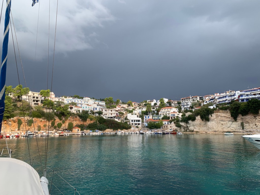 After entering through an almost impossibly tiny keyhole into a blissfully well protected bay we anchored overnight ready to head for the Sporades in the morning. Jumping onto that same wind the next morning we were now able to go with it instead of into it and we flew down to the chain of islands known as the Northern Sporades. They’re a charter boat heaven with good breezes, many summer anchorages, town quays with great tavernas and rugged islands covered in pine forests. After being almost alone up north they seemed BUSY! The anchorage we chose that first night was on the island of Peristera. Suddenly in a tiny anchorage there were 6 boats and barely enough room. The next day even more arrived but most people were pretty good about not dropping their anchor right on top of each other and making sure we all had enough space. It was a bit dark and rainy there that night but over the water we heard happy laughter from many boats and the surprising sounds of a well-played accordion accompanied by 6 elderly German men singing along to some traditional German songs then a few hits from the 70’s which had us laughing along with them. Tie a Yellow Ribbon, Why, Why, Why Delilah, Running Bear. Perhaps they were from the ‘60’s?