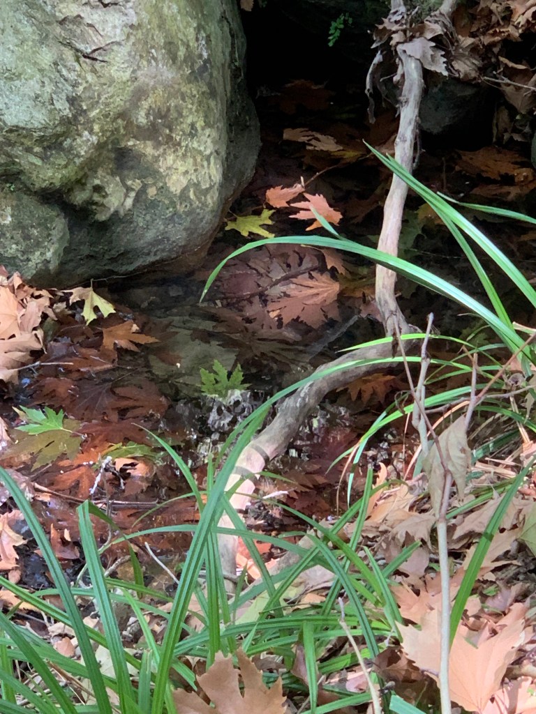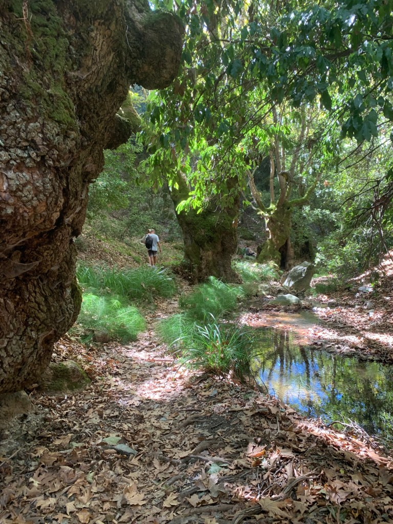 Happily we collected Ambar then whisked her off to an anchorage we had chosen that was well protected from the south. The summer winds, as I have mentioned before generally come from the North and when they blow strongly its known as a Meltemi but obviously this is not the pattern all the time. The problem with this in the Sporades is that most of the great anchorages are protected from the north wind leaving them exposed to the south. We tucked in close to some cliffs on the north-western side of Skopelos and explored the local surroundings. Recommended on the app we use to help us find great anchorages was a local walk. We set off into a wonderland of chestnut and oak trees, wild cyclamens in abundance and a stream leading us to small waterfalls, olive presses, a water wheel for grinding and lastly to a monastery with a view. It was like being taken out of Greece and dropped into England or France for an hour or two. Upon returning to the shoreline we sat at the taverna for a truly lovely meal looking out over the green grass to our boat in the distance.
