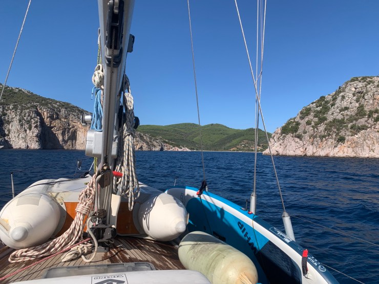 All too soon it was time to go south, and we left after the sun was up, on a beautiful morning in late September, after an unusual request the preceding evening. An English guy had rowed his dinghy over from his boat to ask us to tow him out of the narrow anchorage in the morning as he had gearbox problems and there was little technical help available in the region. Not only that, but the rocks lining both of the narrowly separated shores prevented them from safely sailing out. They felt their only choice was to hitch a tow out into open water and then sail back to Thessaloniki where they had a marina berth and access to reliable mechanics. So, we carefully and slowly towed them out and into the first zephyrs of wind before releasing them to sail homewards with cries of “Fair Winds”.