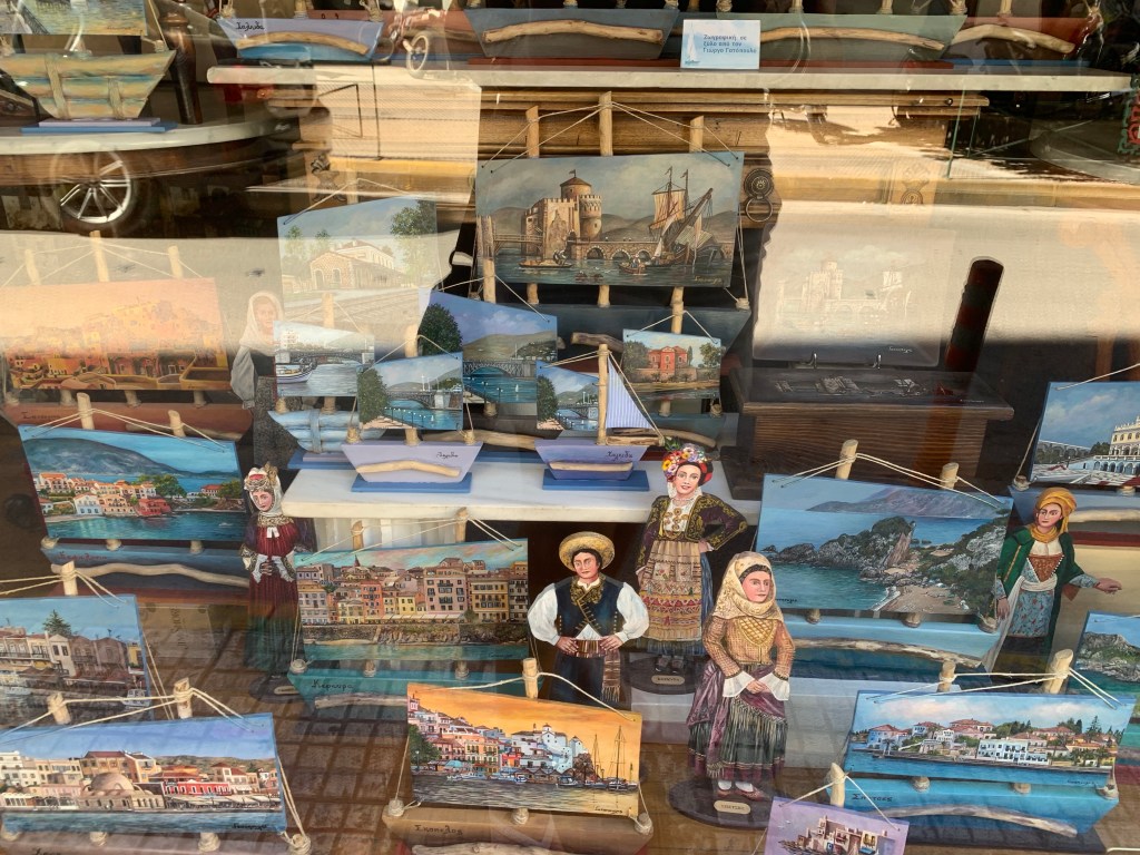 The northern islands of the Sporades comprise Europe’s largest marine parks and boats are only allowed to visit and to fish with permits. On one small island where the endangered Monk Seals breed you are prohibited from going within a 5 miles of the shore. There is no commercial fishing in the park at all. The islands further south are more heavily inhabited and are famous, these days, for being where parts of the Mama Mia movie were filmed. Mama Mia themed everything splattered all over the islands but I think the award goes to bakeries for some odd reason. We saw at least 5 in the main town on Skiathos.
