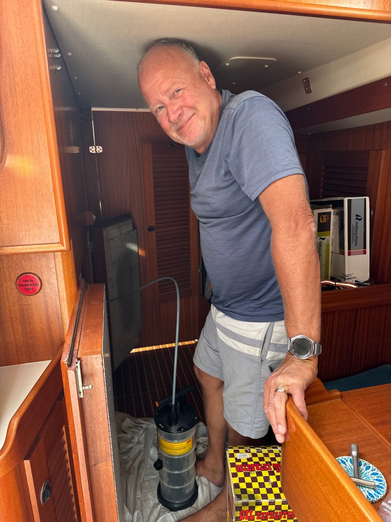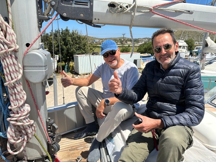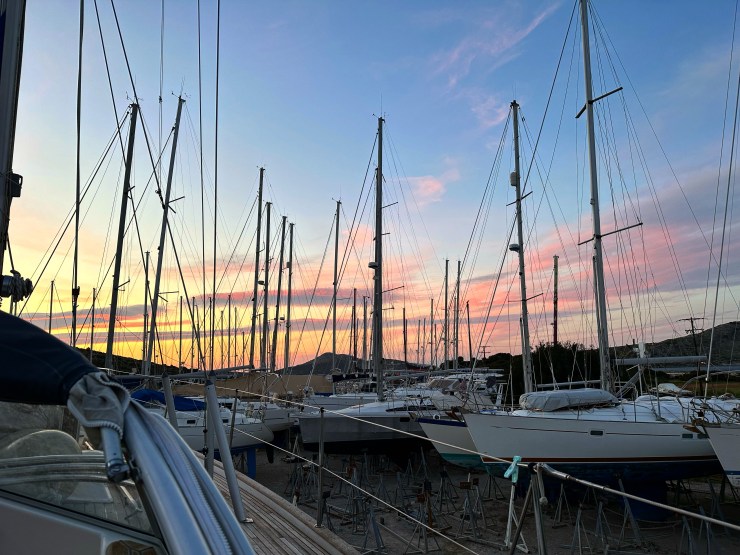 Rick’s biggest job was to repair the boom vang which broke at the end of last season. It was a complicated fix and the repairs were inside the mast and you get little access to this from the outside. Nick flew in from Athens to help troubleshoot this job and while there were a few false starts the job was completed successfully. While the guys did this I went back to my old job of varnishing the cockpit table and various other pieces of teak that needed doing. I got another 4 coats on them before they were all screwed back in place. I counted 54 jobs on our to do list, much of it being routine maintenance or jobs that need to be done specifically whilst out of the water. The big and sometimes messy jobs were changing engine oil and the filters and servicing the toilets. The numerous small items carefully collected in Australia were unpacked and attached or packed away where they belonged. Shackles, anodes, jammer cleats, not to mention a second inflatable SUP and attachments to enable it to be sailed at anchorage.
