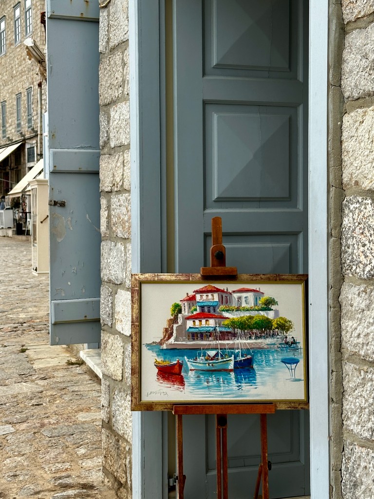 Beauty inspires art and Hydra is lovely. The town is filled with everything that we love about the Greek Islands: crystal clear water, civic pride that means its super clean, loads of well fed and desexed cats, art and sculpture in public places, and outdoor cinema, only a small amount of charmingly neglected old buildings, whitewash, bougainvillea, mulberry trees, interesting alleyways, castles and fortifications. People sit in the bars and tavernas talking over coffee, playing backgammon, dance at night in the back streets and sip wine overlooking the twinkling lights of the harbour.