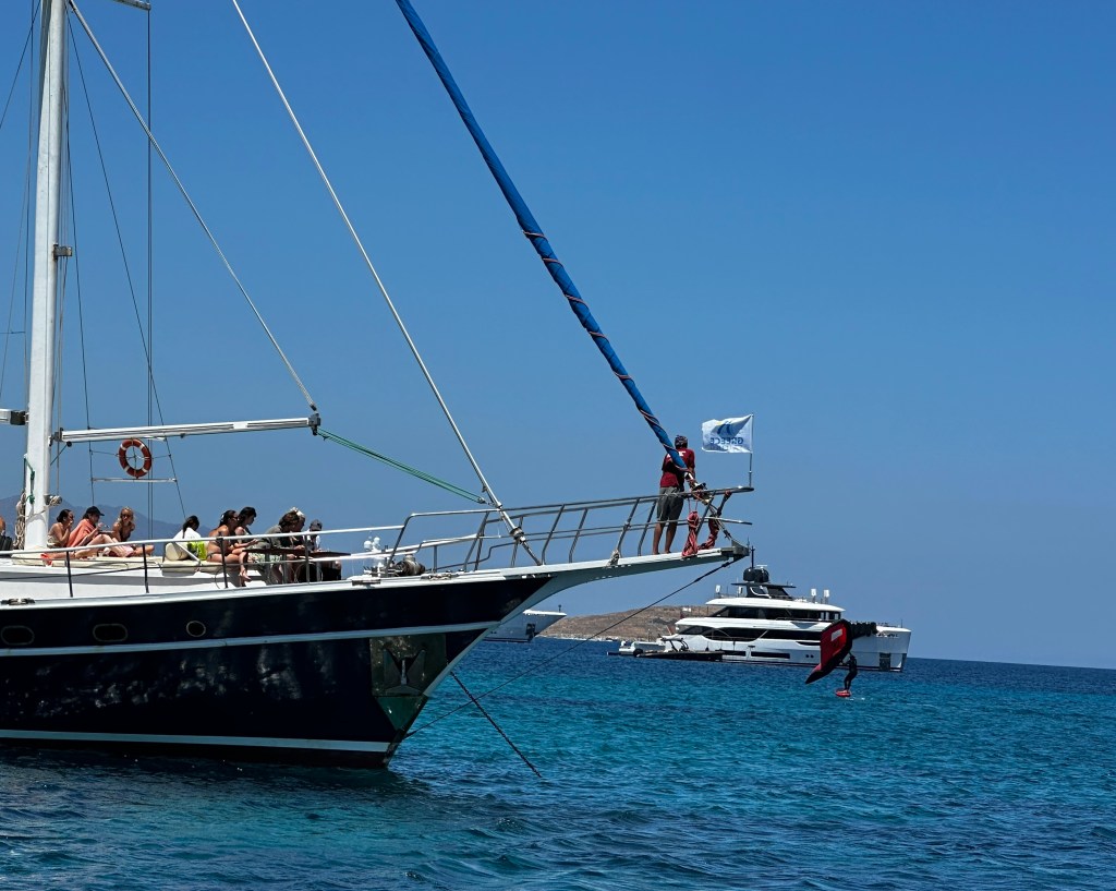 After that bit of cockpit philosophy, we headed off towards Tinos, another place we considered too windy to visit and had therefore decided to squeeze in during this calm period before the summer winds started up in earnest but not before Rick had his first successful kite foiling session of the season.