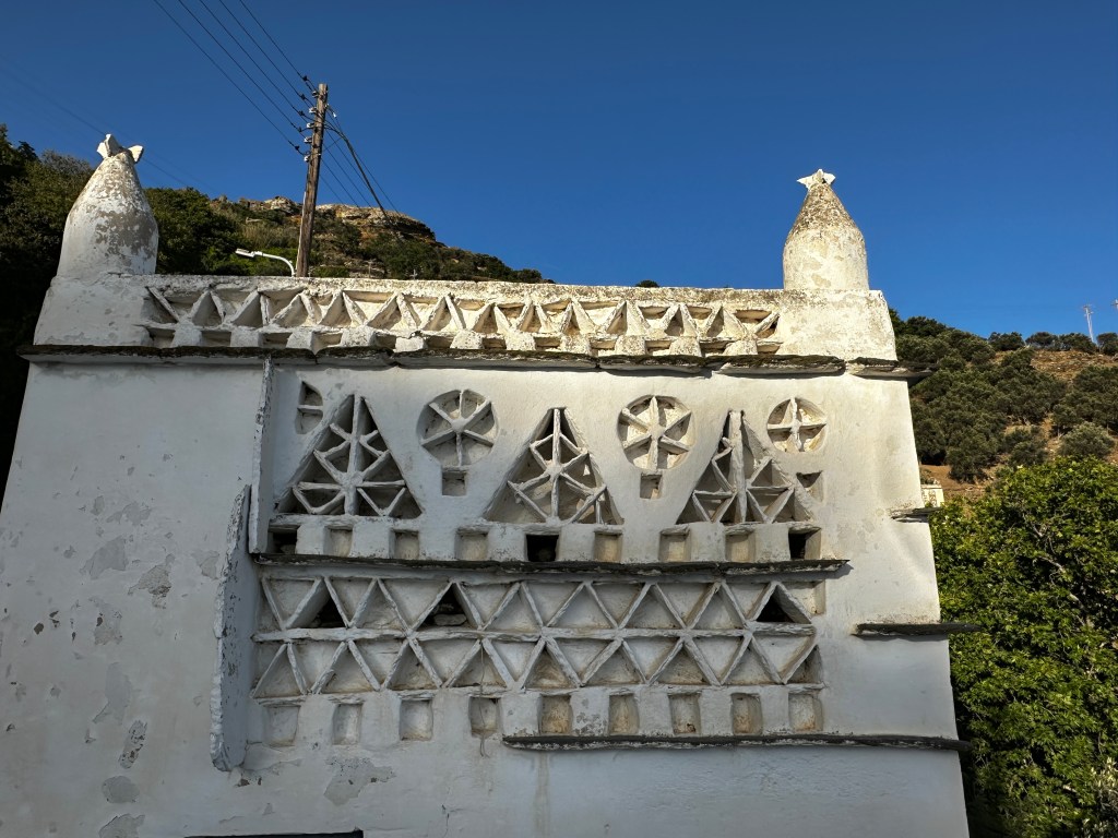 The Greek islands are all drowned mountain tops and some of them still look like this today. Tinos looks like the wild and rocky top of an ancient mountain. The main town is arrayed around a small harbour but the most villages on the island are hanging by their toes to the sides of steep slopes or tucked into small flat areas up on the high boulder covered plateau. The traditional architecture of white block shaped buildings or rough-hewn unadorned rock homes with marble inlays were stacked up hillsides. Often villages contained just homes, a few villas for rent, a church and perhaps a dovecote and no other services. The dovecotes that dot the island can be traced back to the Venetians who ruled the island from the 1300’s to the Ottoman times. They build them all over the island to attract pigeons for breeding (mainly for eating and to use their droppings to enrich the rocky soil). The doves and pigeons often still make use of them today. It’s said that the patterns used in building them attract the birds.