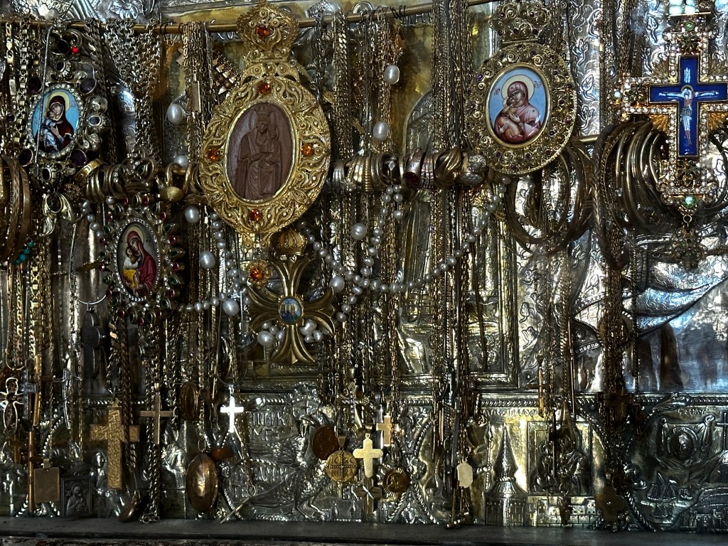 People asking for a miracle or for the Virgin’s intersession in their life will make the journey from the port on their hands and knees. We, however walked up to the church early in the morning when there was no one making their pilgrimage. We entered the church to discover it full even though it was really early. A priest was giving a sermon but people were circling past and kissing the glass covering of what looked like a painting covered in jewels. This was the Icon. I couldn’t see the Virgin at all as she was so adorned. An attendant cleaned the glass after people has kissed her and people filed by then to light candles to her beyond the queue. The reverence and sacredness in this space was palpable. After spending some time we left the faithful to their prayers and went in search of the holy well which turned out to be in a small chapel under the main church. We had bought a few small bottles to fill with water but had to wait for a guy filling his one litre water bottles first. We wondered what he was using them for.