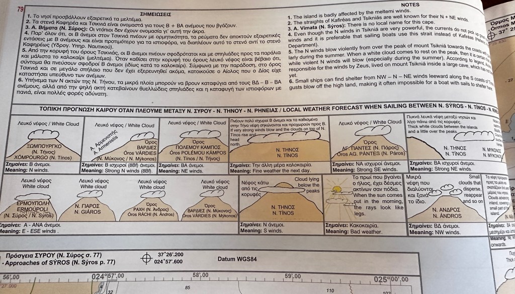 We rarely wake up with no idea of what we are going to do as the weather dictates all of our movements and thatโ€™s pretty obvious really but letโ€™s unpack it a little more anyway. For example, we are currently in a Meltemi which is the northerly wind that typically blows through the Aegean in the summer months for 3-5 days at a time. It usually blows with a force hard enough (15-30+ knots) to mean we may need to shelter in a protected anchorage for a few days so we need to know when they are coming and plan accordingly. This means choosing an anchorage that will be protected from the north.ย  Mostly we use a combination of methods to decide this.ย  We have a Greek Waters pilot guide, a second Greek publication called the Eagle Ray Guide which is super as it has lots of anecdotal information taken from fishermen that give insight into very localised weather conditions.ย  We learnt all about coffin shaped clouds that sit over islands during a meltemi and even secret spots to anchor.
